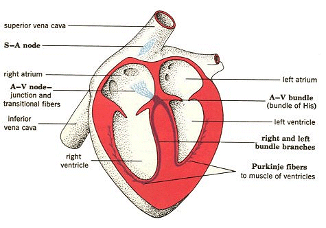 After passing through the AV node, the impulse reaches the bundle of His and again moves faster, passing through the right and left bundle branches and to the terminal Purkinje fibers in 0.03 to 0.05 second. The Purkinje fibers penetrate the ventricular wall from the endocardial surface, and only for a part of its thickness. From the Purkinje fibers, the excitation impulse then continues through myocardial cells outside the specialized conduction pathway, and a final 0.03 second is required to reach the epicardial surface. This rapid, simultaneous spread of excitation through the ventricles produces a coordinated contraction of both ventricles, thus ensuring efficient pumping of blood to the pulmonary and systemic circulations.